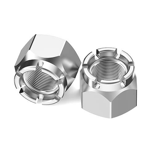 A Castellated Nut (also known as Caster Nut) is a nut that look like crowns of medieval castles. These nuts are used together with a bolt and a cotter pin to create a secure nut in place so that it cannot be tightened or loosened.