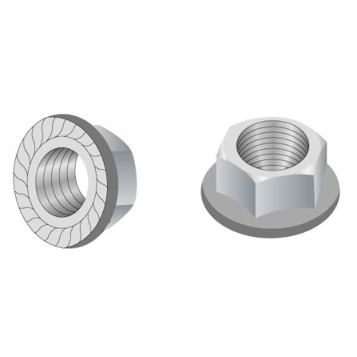 Flange nuts have a washer-like base to distribute pressure over a greater surface area and ensure the fastener stay tight. They are commonly used in manufacturing assembly lines where operations are speeded by using a single fastener instead of a nut and washer.